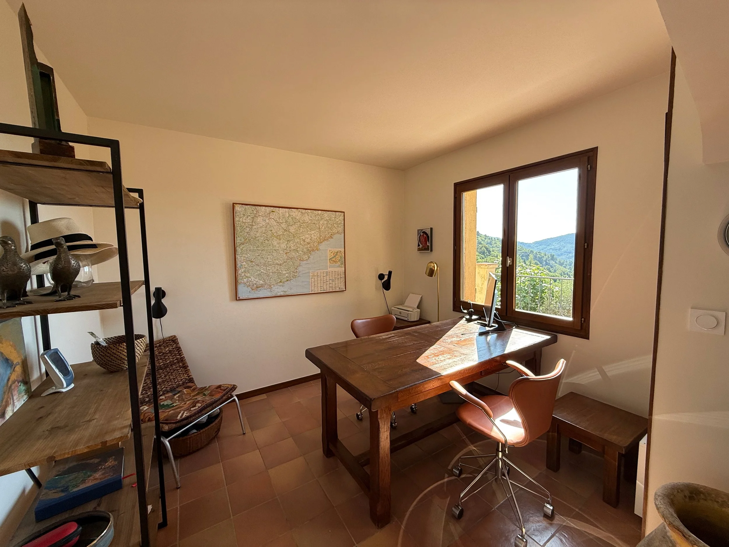 Det lille hyggelige kontor gør det muligt at passe lidt arbejde mens man nyder udsigten over bjergene, og resten af familien hygger sig i stuen. Her er printer og en skærm der tilsluttes med USB-C (opladning og grafik).